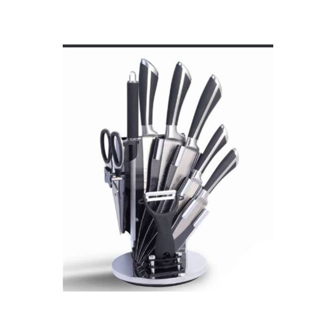 Sharp, stainless steel set with wooden block stand.